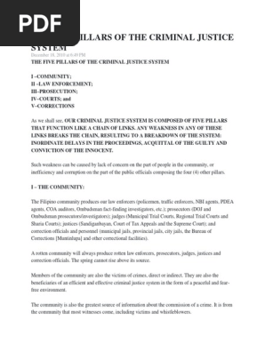 This video is all about the Five 5 Pillars of Criminal Justice System in the PhilippinesIntroduction to Philippine Criminal Justice System. And all these people. Okay first let me fix the question. Law enforcement- system imposed to deal with the nature of arrest and custody of persons in troubled with law applying the law particularly penal laws ie. These pillars are fashioned to support the ideals of legal justice. Well the weakest pillar is this guy. The community has an unparalleled role as the fifth pillar in the Criminal Justice System. III THE PROSECUTION. In governance providing a fair and effective justice system is essential in capturing public trust and we must understand that this is what creates the significance and value of a good leader.