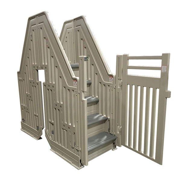 This top-of-the-line gate system is designed to meet the most stringent of above ground pool safety codes and includes double handrails on both sides as well as a self-closing gate that opens outward and security details. This super-strong double step entry system is a hybrid between a ladder and step. Asked on 5262015 by judy.
