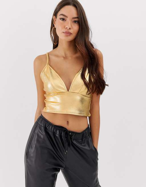 Coming in at just 58 grams it wont weight you down at all. Forever 21 O-Ring Crisscross Bralette 909 1299. An on-trend bralette featuring a lace foil detailed design and thin straps. Get a Sale Alert. Navy silk bralette set has metallic bronze leafing at the cups in an abstract crinkle pattern. Get your festival vibe on or just glam things up a little for the beach with this gorgeous metallic bralette. Non-underwired triangle bralette as a multi-hook long line band and adjustable straps. The images do not do it justice as the shimmer is amazing under the perfect lighting Trust us. Dolce Gabbana Metallic-Effect Bralette Top.